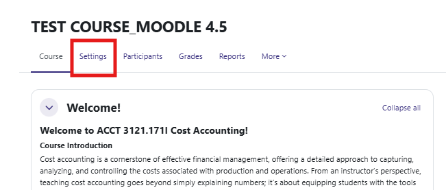 1. While on your course’s main home page, click on “Settings” under the Course Name/title.