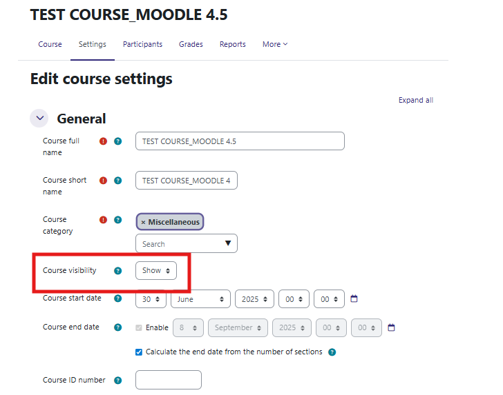 2. Under the “General” section, Find the “Course Visiblity” heading and adjust the dropdown box to Show. The default is to hide the course from students until the professor opens it at their discretion. Once selecting “show”, you will select save changes at the bottom of the page
