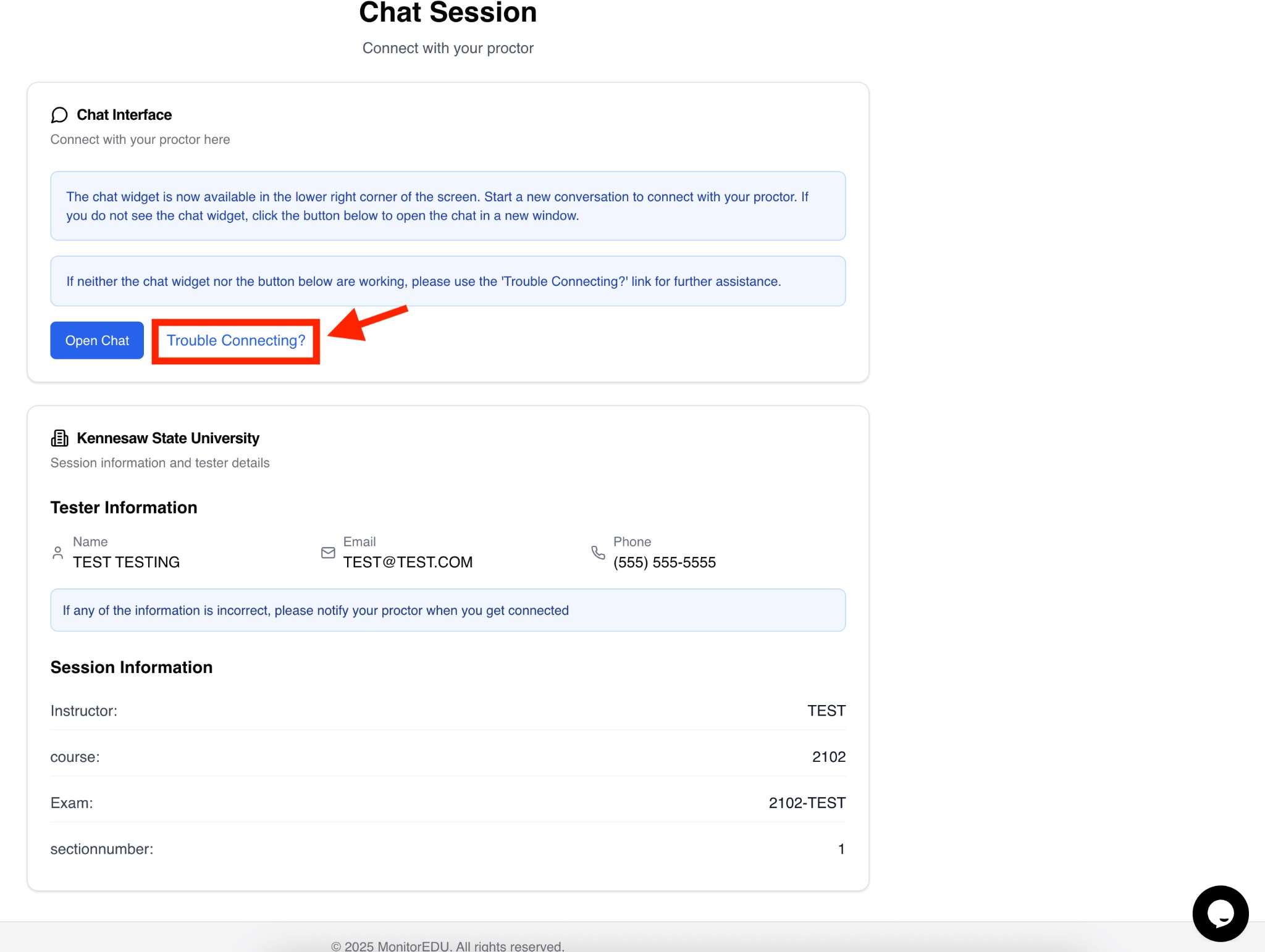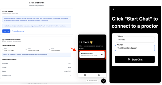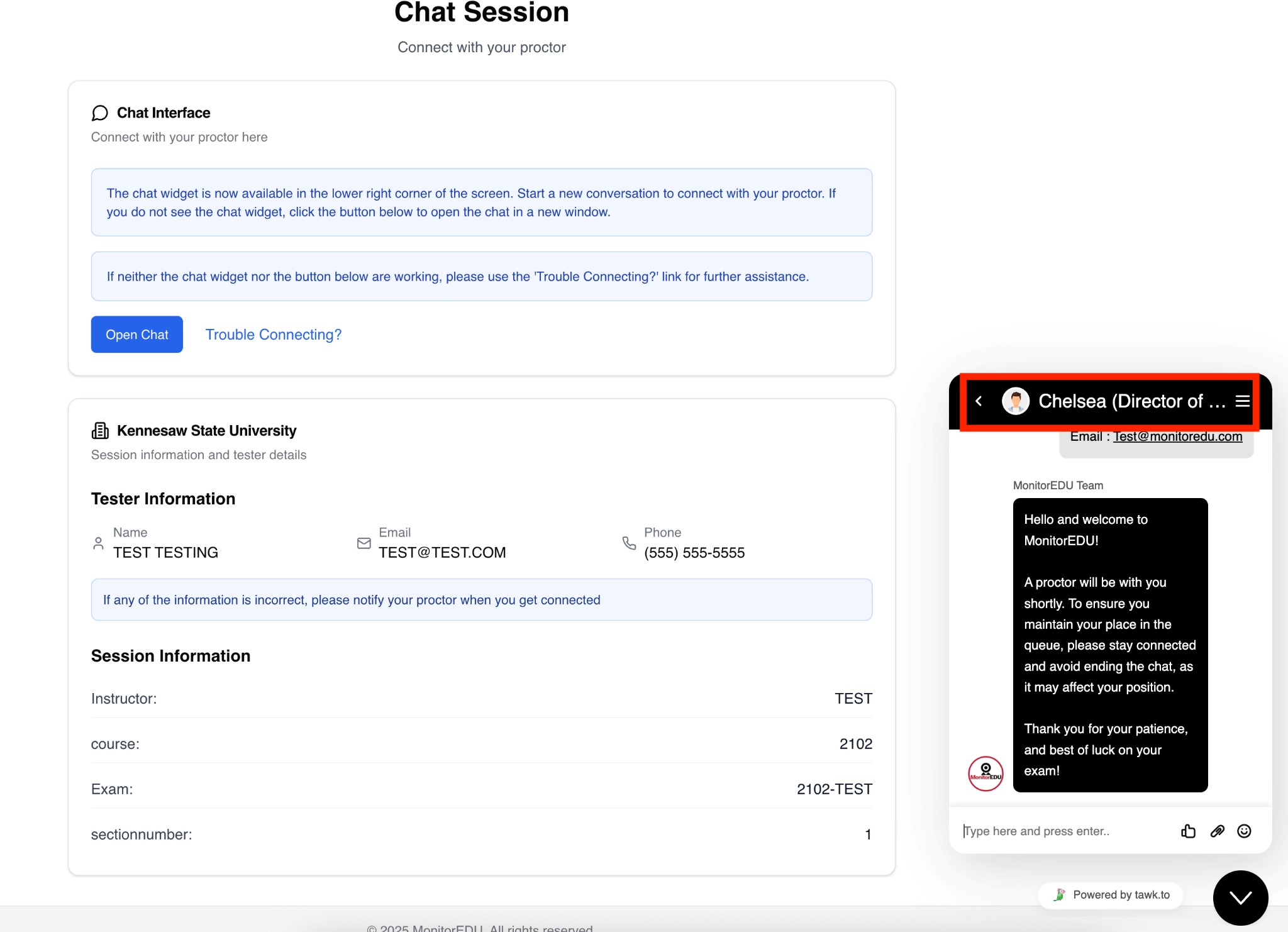 - When a proctor joins, it will add the proctor's name to the top of the chat session.
