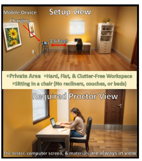 - Environment Scan: You will need to complete a full 360° scan of your testing environment showing all four walls, over the desk, above the desk, and below your desk.