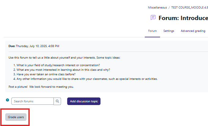 Whole forum grading is a new Moodle feature that allows instructors to assess student forum postings from a grading interface that collects all student postings and displays them on one page.