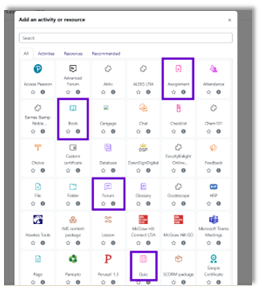In Moodle 4.5, adding activities and resources to courses has a new, streamlined look and improved functionality. The process of enriching courses with engaging content and valuable resources is now smoother and more intuitive. The interface for adding resources and activities has been refined to be more user-friendly, presenting activities in a clearer grid format to easily view and select.
