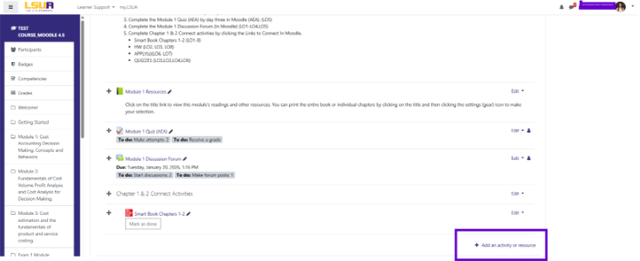 Moodle 4.5 – Add an Activity or Resource when Editing is Turned on