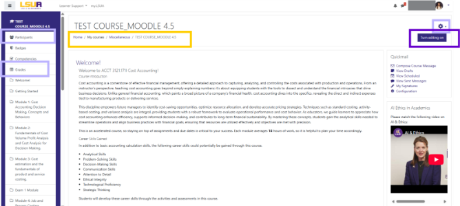 Lavender boxes: The “Gear” and left column selections like Participants and Grades have been replaced by tabs located under the course Name. Expanding and collapsing Module content is also available.