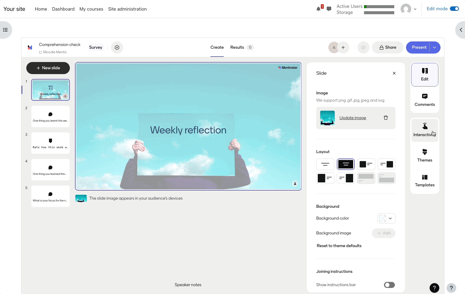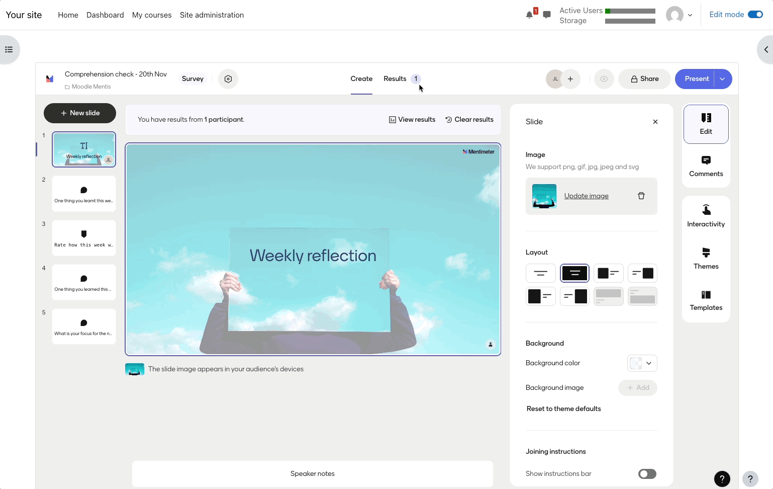 Open the Menti from the course view. This will take to you the Mentimeter editor - now in your LMS. From here you can: