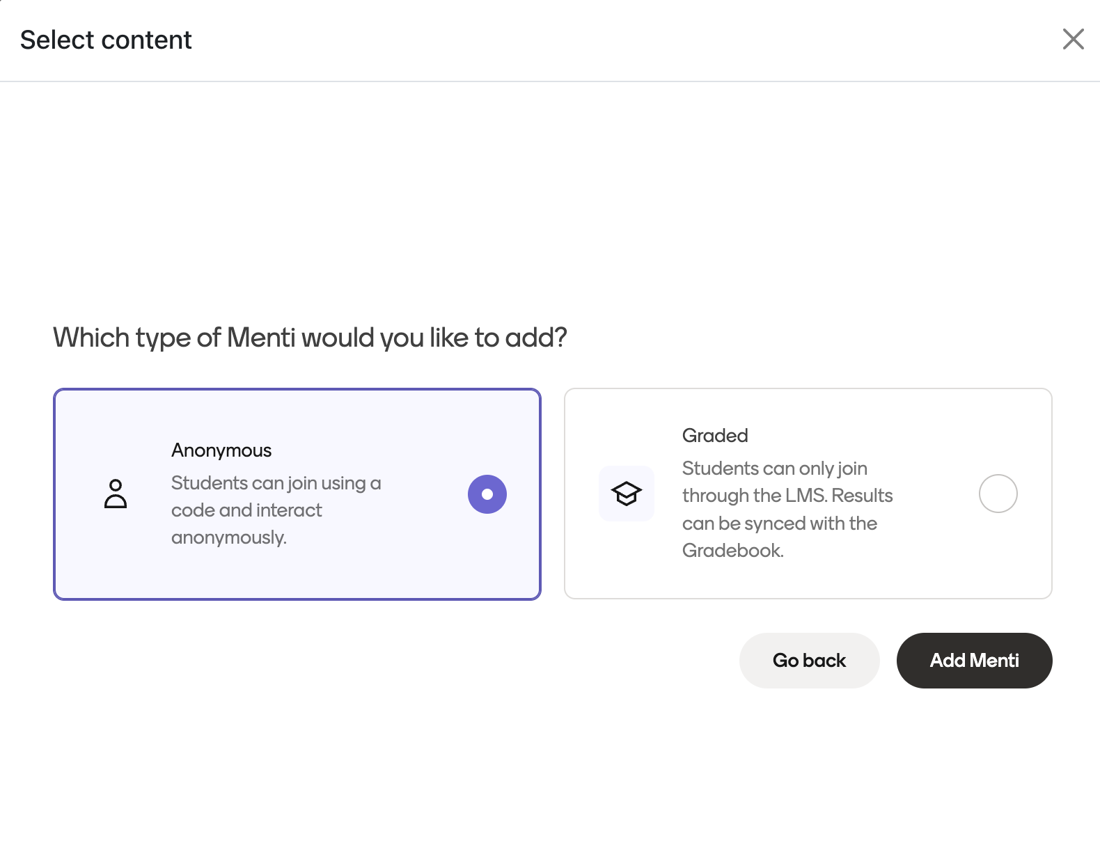 You will be asked to choose whether the Menti should be anonymous or graded.