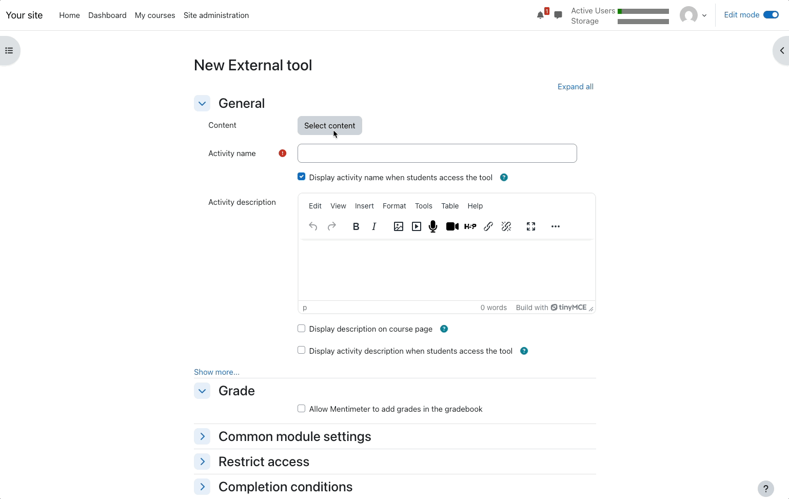 Toggle on "Edit Mode" and find the Module you want to add the Menti activity. Click Add Activity or Resource and find Mentimeter.